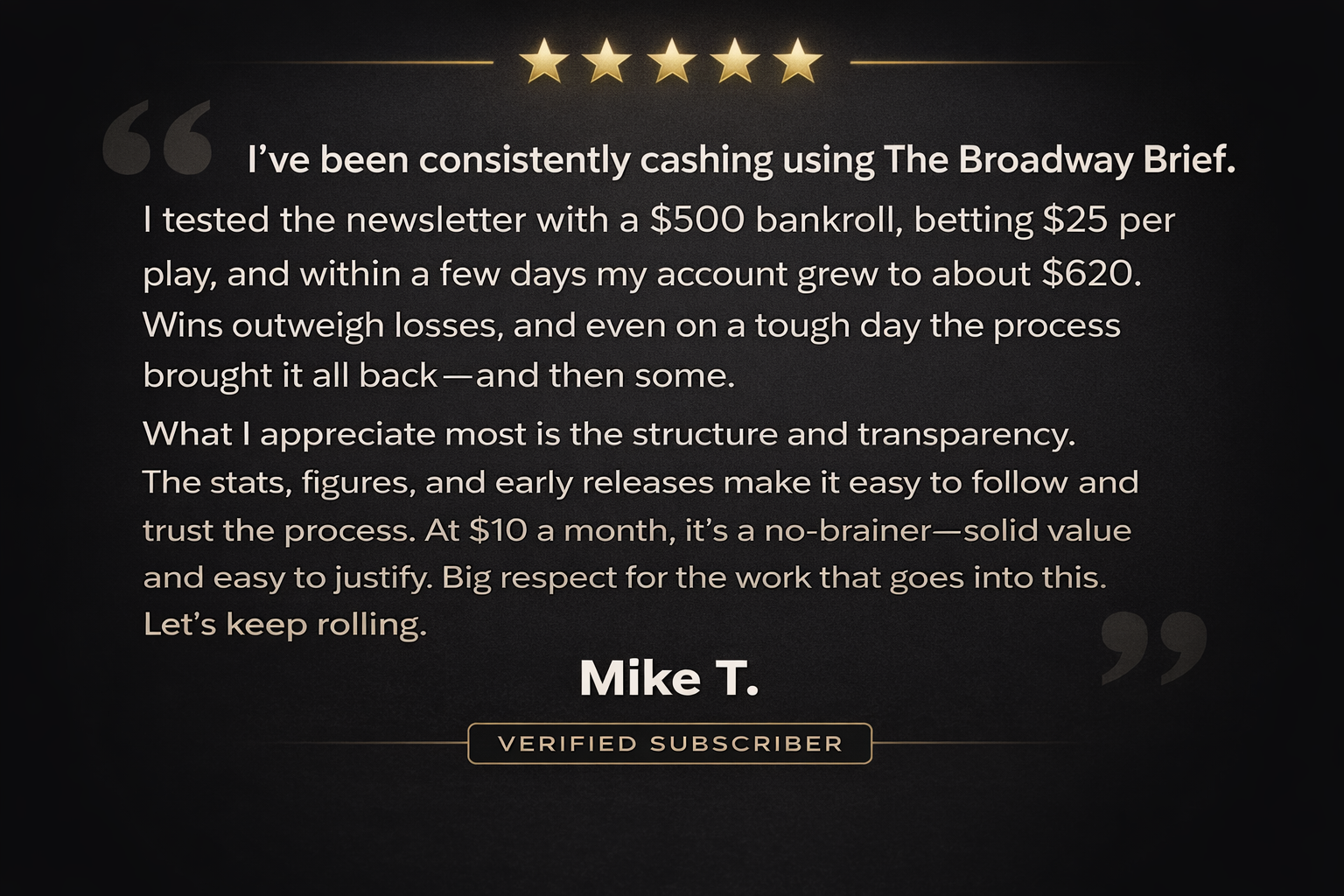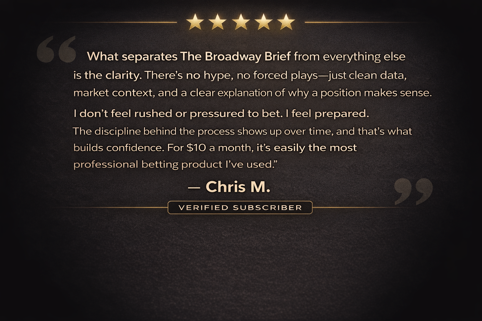 The Broadway Brief is built on clarity, structure, and repeatable edges — not hype or guesswork. Every position is explained. Every angle is contextualized. Win or lose, the process stays intact.